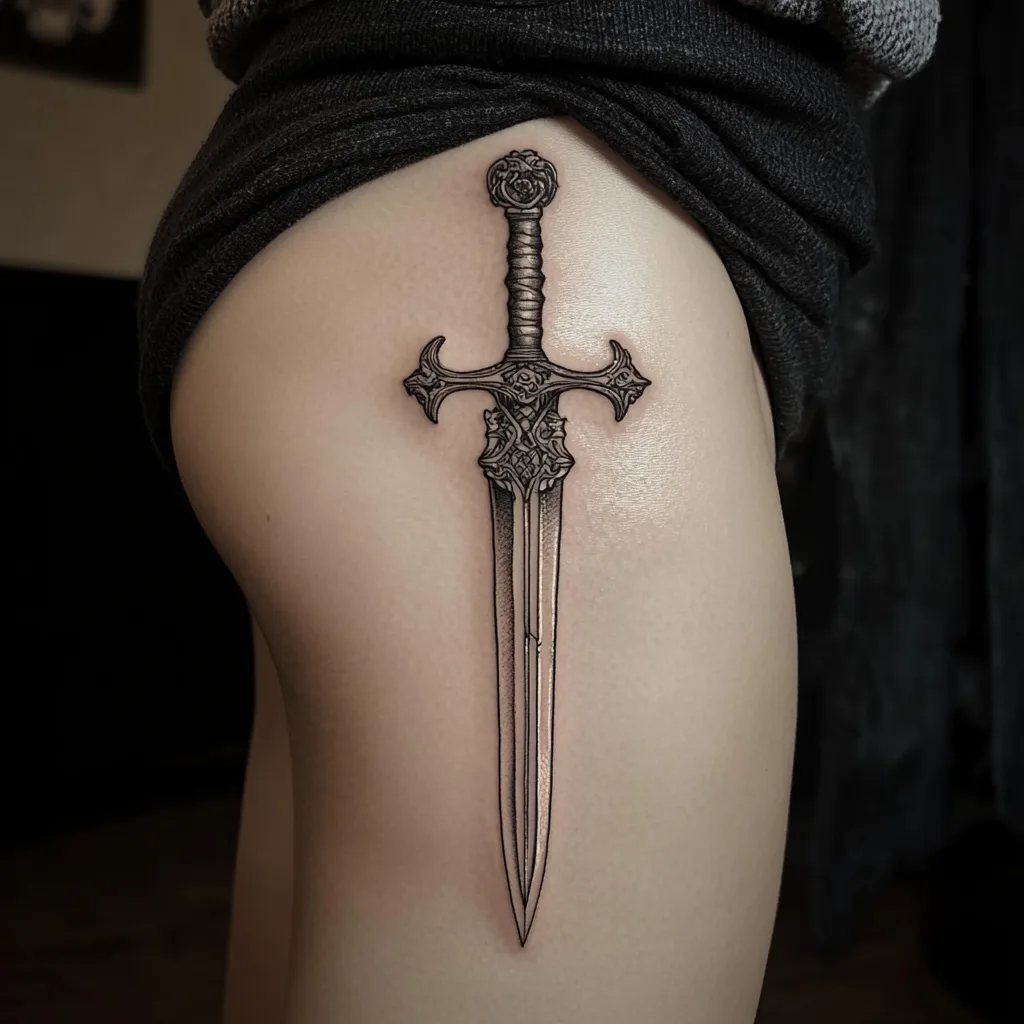 A sword or dagger tattoo represents strength, protection, and resilience. When placed on the hip, it creates a powerful and bold aesthetic. Many choose daggers entwined with roses or vines to add a symbolic touch.