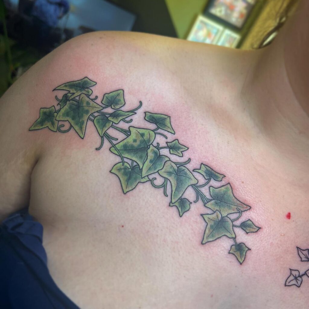 This piece gracefully extends across the shoulder and collarbone, featuring ivy leaves shaded in cool greens. The design captures the organic way ivy spreads, enhancing the natural contours of the body and making the tattoo look alive with movement.