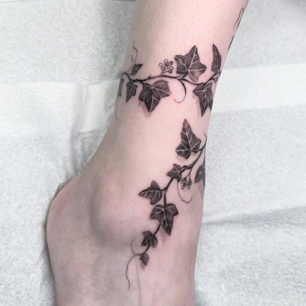 This tattoo elegantly circles the ankle with detailed ivy leaves in fine black shading. The vine wraps naturally around the skin, with leaves and small clusters of berries adding depth and intricacy. The shading gives the leaves a realistic texture that enhances the design’s elegance.