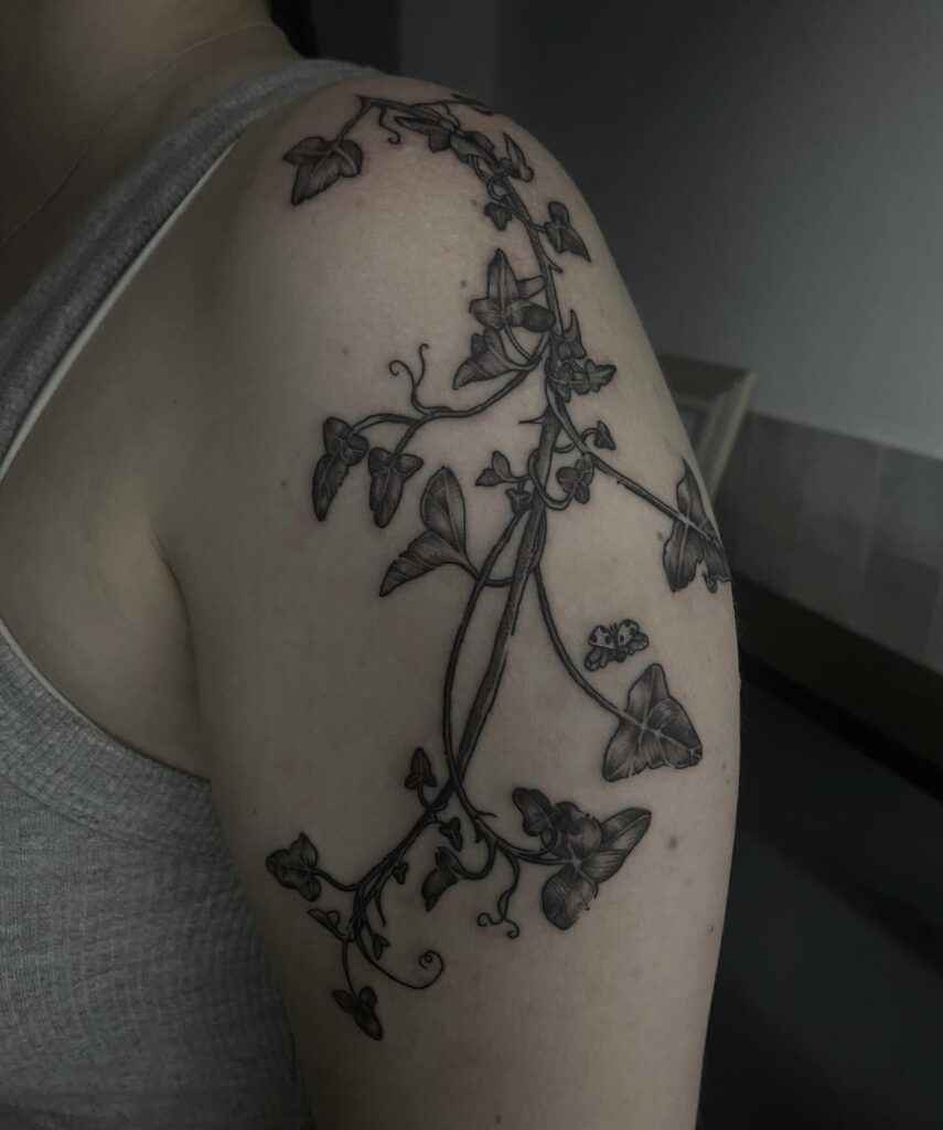 This striking shoulder tattoo intertwines ivy vines with softly shaded butterflies, creating a delicate yet bold piece. The detailed linework emphasizes the curling nature of the ivy, while the butterflies add an airy, symbolic dimension of freedom and transformation.