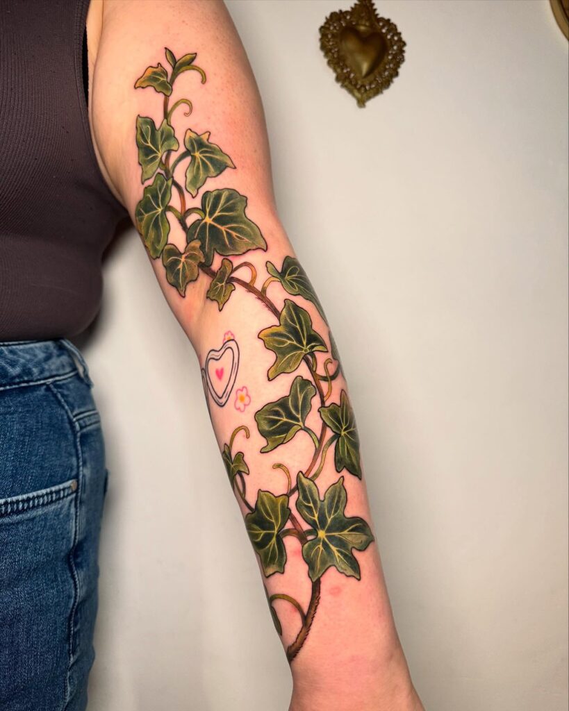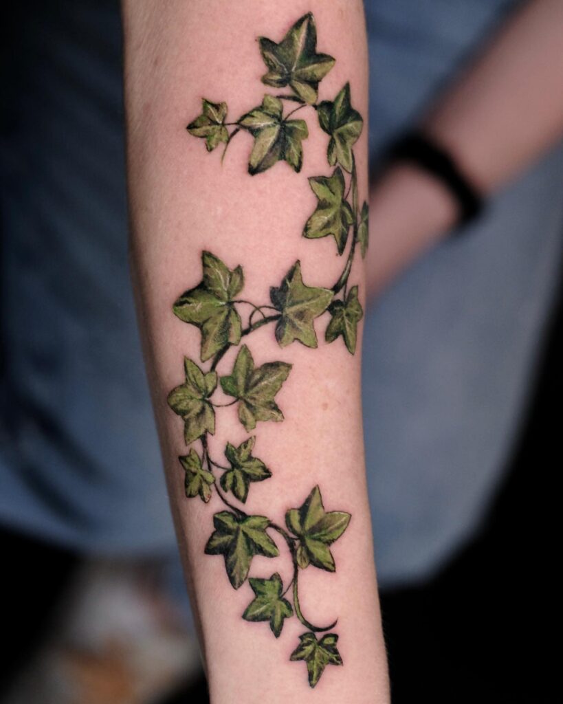 This tattoo shows clusters of ivy leaves winding across the forearm in shades of deep and soft green. Each leaf is carefully shaded to highlight its texture and natural details, giving the piece a realistic yet artistic look.