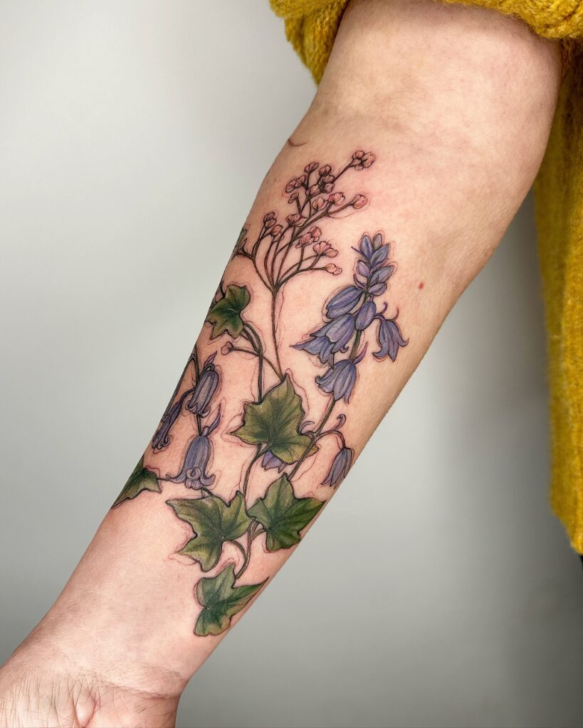 This tattoo blends the grace of ivy with the delicate charm of bluebell blossoms, creating a vibrant yet natural design along the forearm. The green ivy leaves weave organically, symbolizing endurance and connection, while the purple flowers bring a soft, feminine touch that enhances the flow of the piece.