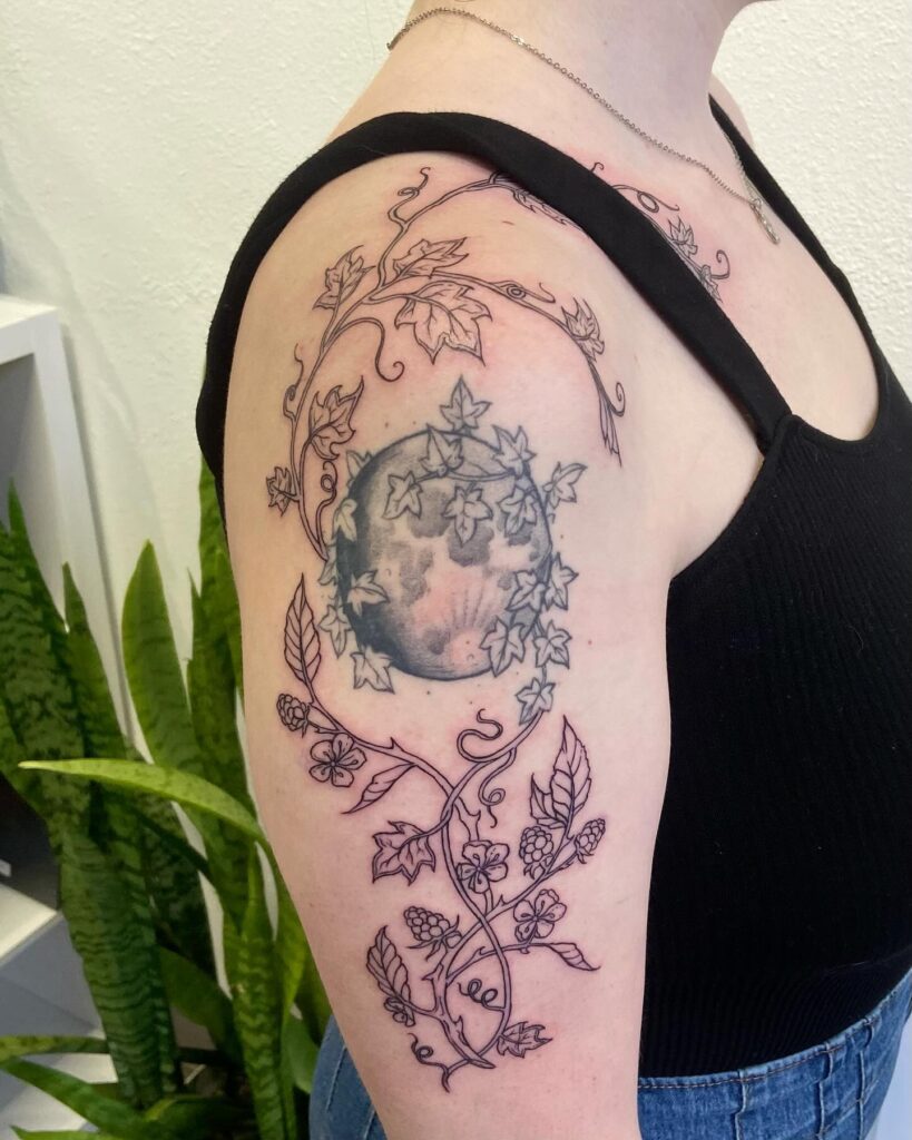 This detailed shoulder tattoo combines the symbolism of ivy vines with a striking full moon design. The ivy curls gracefully around the moon, creating a sense of unity between earth and celestial elements.