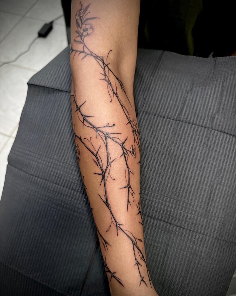 This forearm tattoo is defined by its thin black lines, forming a long vine decorated with delicate sprigs. The design is simple yet elegant, relying on fine detailing rather than heavy shading. Its flowing shape allows the tattoo to naturally complement the length of the arm.