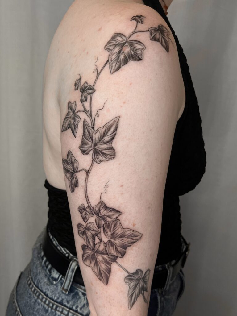 This tattoo showcases a traditional black-ink ivy vine wrapping along the arm and shoulder. The shading highlights each leaf’s texture, creating contrast and definition while keeping the overall design clean and bold.