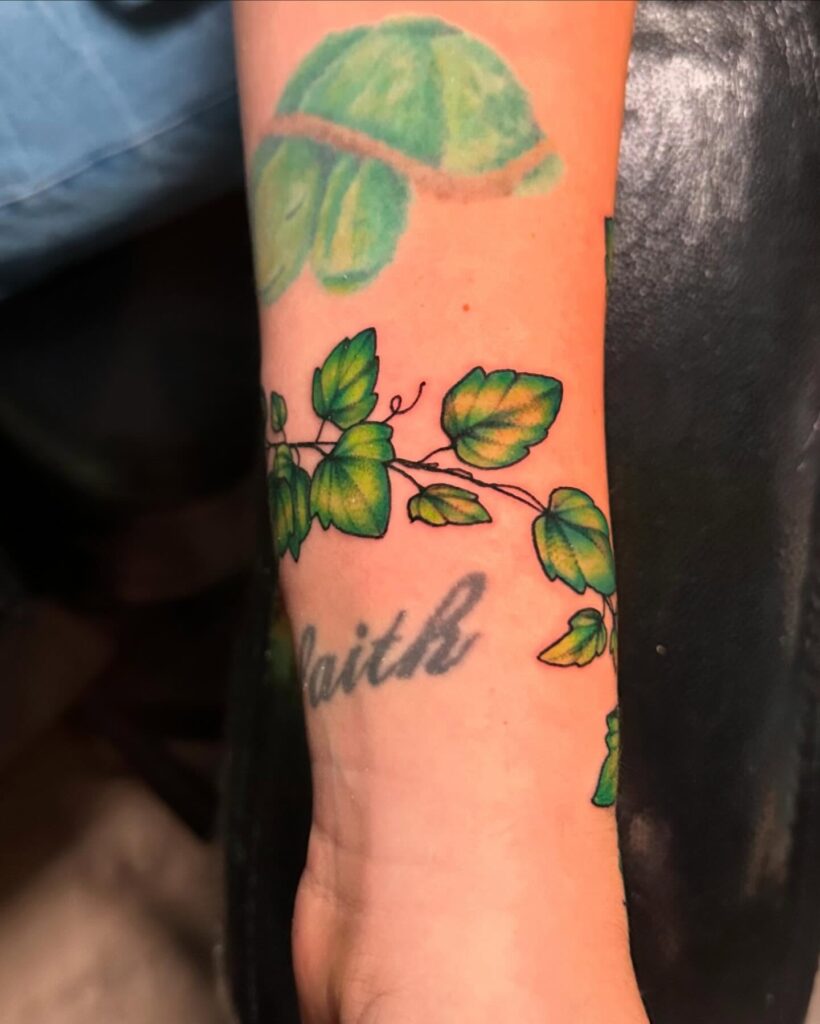 This tattoo features lively green ivy leaves that curve gracefully around the wrist and forearm. The design is enriched with vibrant shading, giving the leaves a sense of depth and realism. The ivy, known for its symbolism of eternal growth and loyalty, naturally complements the placement.