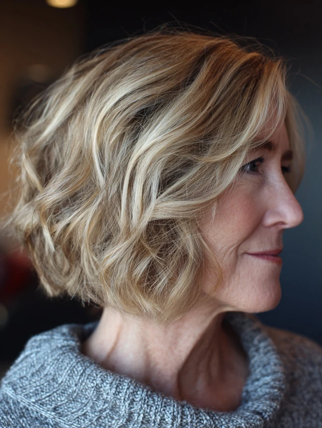 A layered bob with soft waves adds gentle texture that enhances movement and volume. The waves complement the layering.