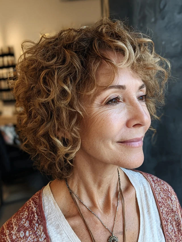 A curly layered shag enhances natural curls while shaping them through varied layers. The curls add body and softness.