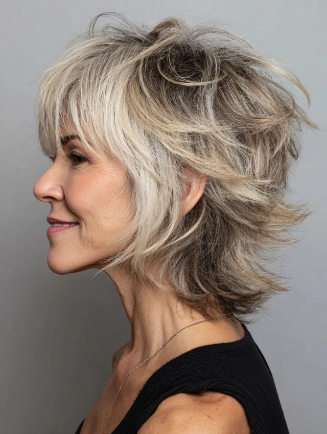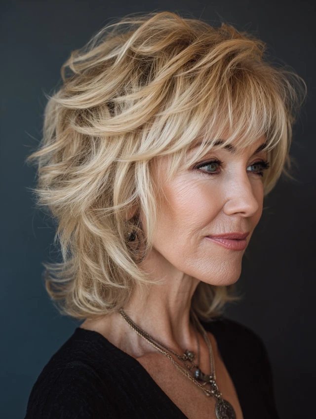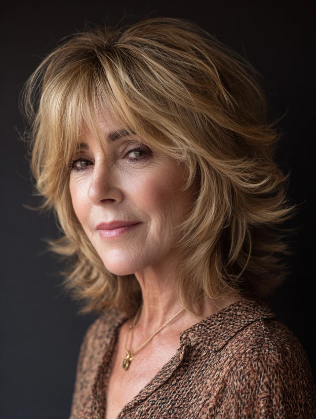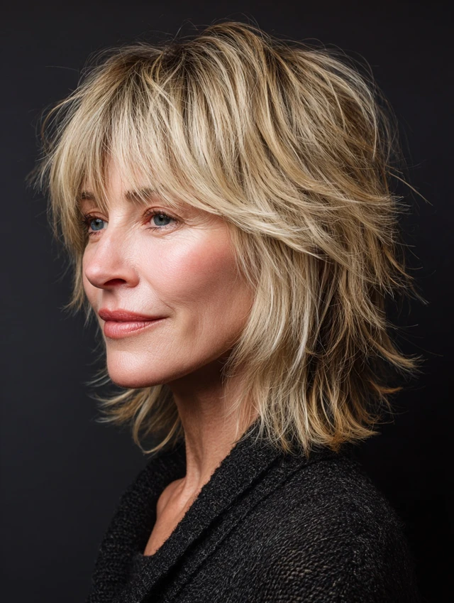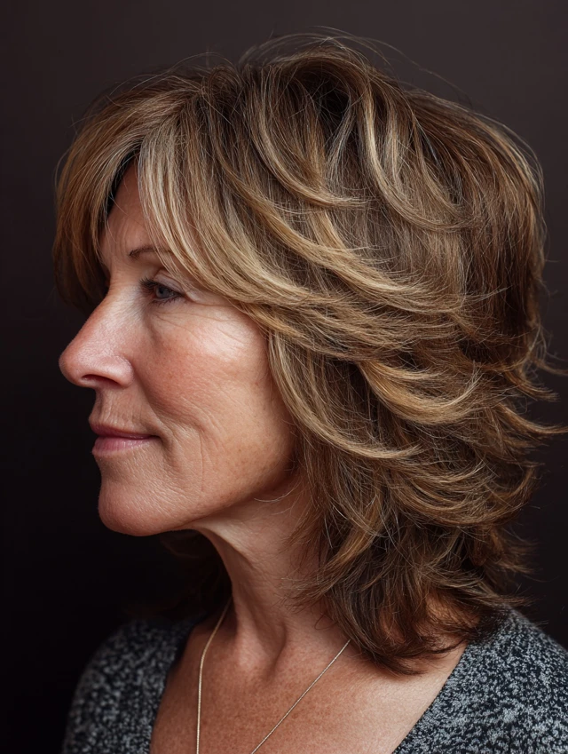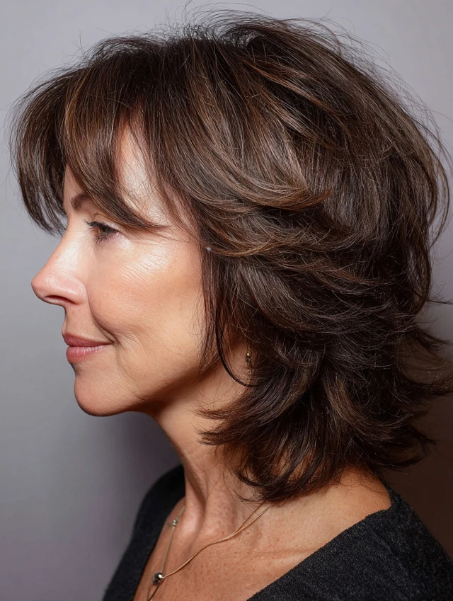 Layered shag hairstyles for women over 50 offer a perfect blend of texture, volume, and ease. The varied layers create movement while keeping the style light and modern.