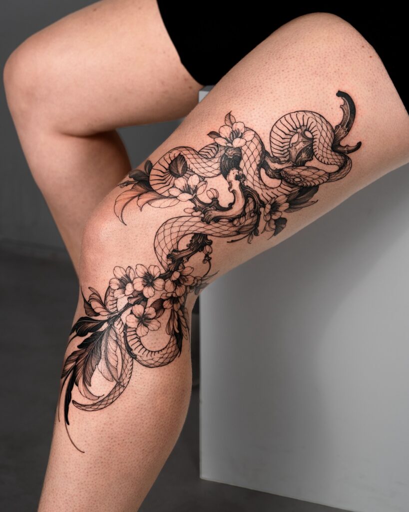 11. Floral Snake Thigh and Calf Tattoo