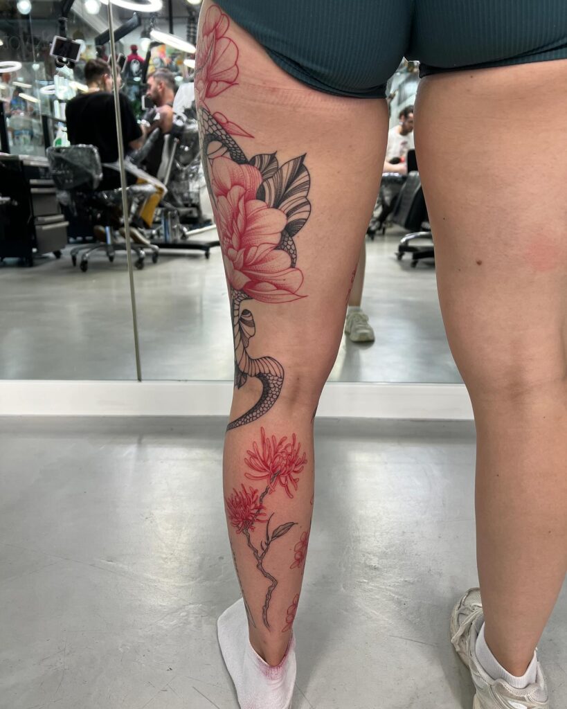 This tattoo features an elegant snake winding through large, soft florals that span the thigh down to the calf. Fine black linework contrasts beautifully with subtle red ink accents, giving the flowers a delicate, almost sketched appearance. The snake’s scales are meticulously detailed, adding texture and movement while guiding the eye vertically along the leg. The placement enhances the natural curves of the body, creating a harmonious flow from hip to ankle.