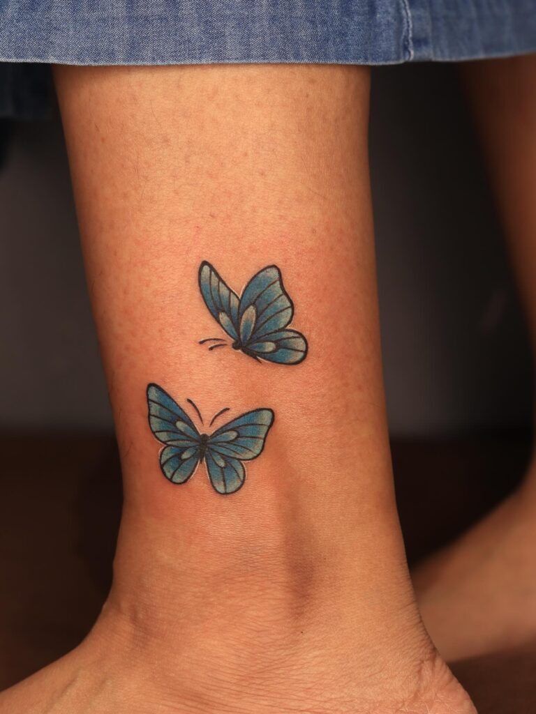 This delicate ankle tattoo features two small blue butterflies rendered with soft shading and clean outlines. The vibrant blue tones contrast gently against the skin, making the butterflies appear lively and light. Their placement near the ankle adds a sense of movement, as if they are mid-flight. The compact size keeps the design subtle yet eye-catching.