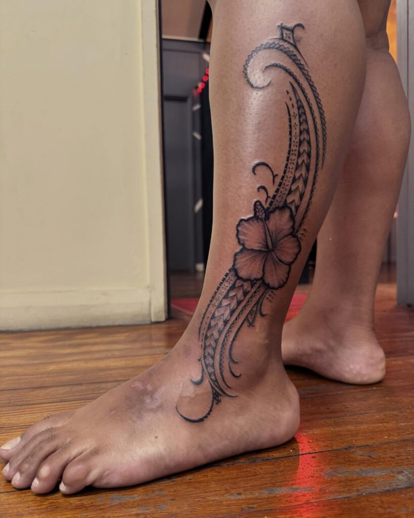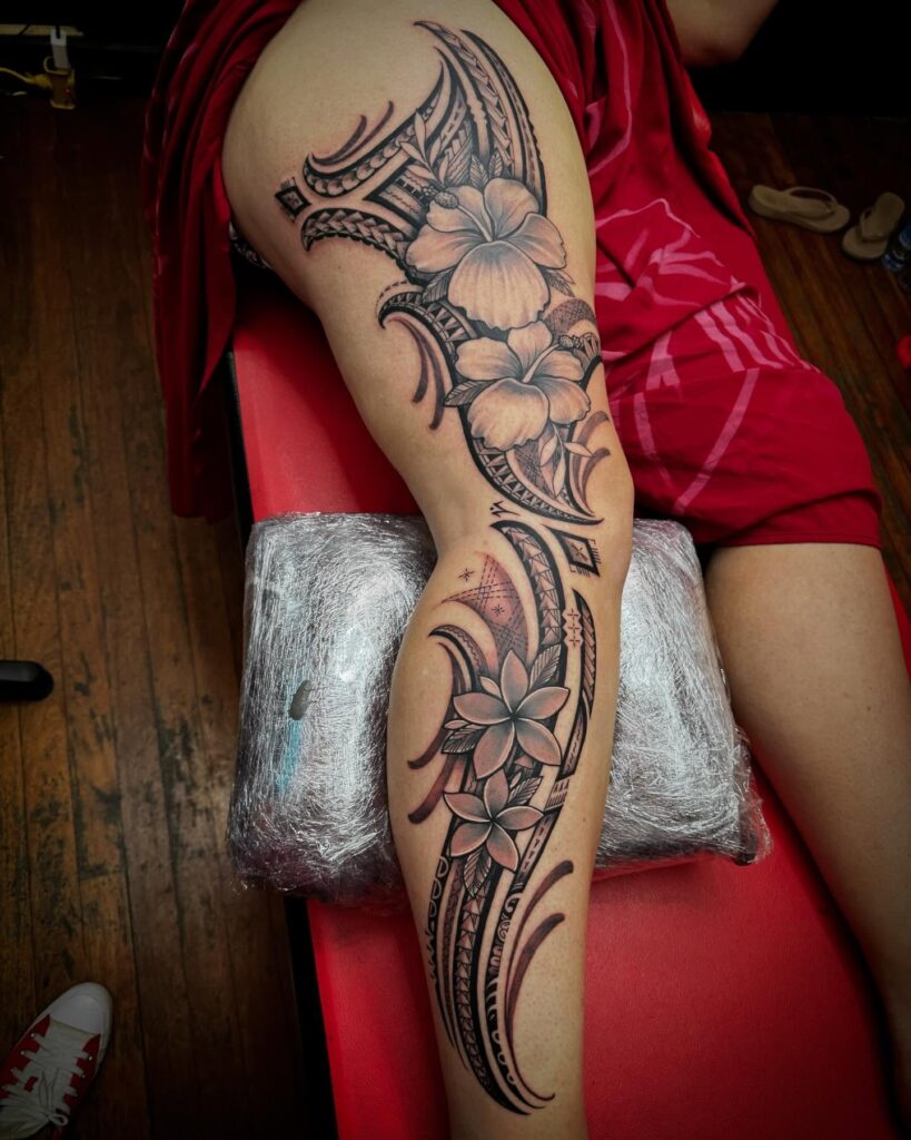 This leg tattoo combines Polynesian-style patterns with large floral elements, creating a bold yet elegant sleeve. The geometric motifs add rhythm and structure, while the flowers introduce softness and femininity. Strong black lines and consistent patterns ensure clarity and cohesion across the entire leg. The design flows seamlessly from thigh to calf, enhancing the leg’s natural shape.