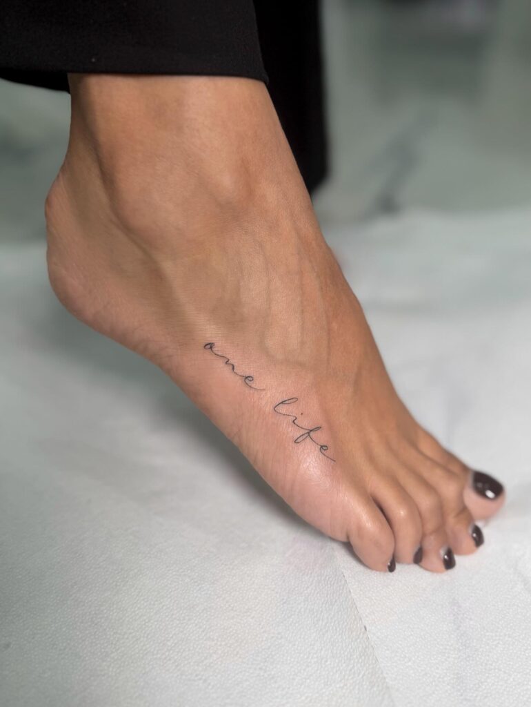 This tattoo features a single word written in fine, delicate script along the side of the foot. The thin lettering feels intimate and understated, blending seamlessly with the natural lines of the foot. Its placement keeps the design subtle, visible only when desired, adding to its personal nature. The simplicity enhances its emotional impact.