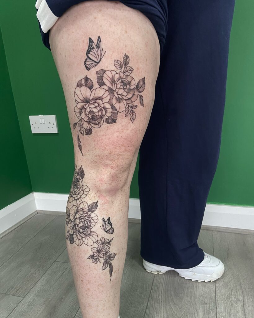 This leg tattoo showcases a refined blackwork composition of blooming flowers accompanied by softly hovering butterflies. The flowers are rendered with delicate shading and precise outlines, creating depth without overwhelming the skin. Butterflies are strategically placed to add lightness and movement, making the entire piece feel airy and balanced. The vertical layout follows the leg’s natural anatomy, enhancing elegance and length.
