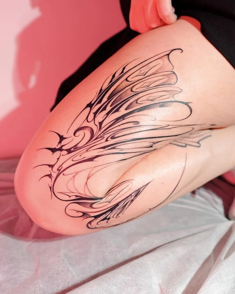 This tattoo features a bold abstract design flowing across the thigh with sharp curves and elongated shapes. Clean black lines form a symmetrical yet fluid pattern, creating a striking contrast against the skin. The design feels modern and expressive, almost architectural in its structure, while still maintaining a sense of motion. Its placement emphasizes the thigh’s contour, making the artwork appear sculptural.