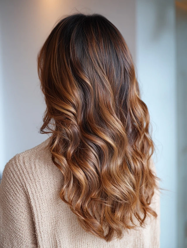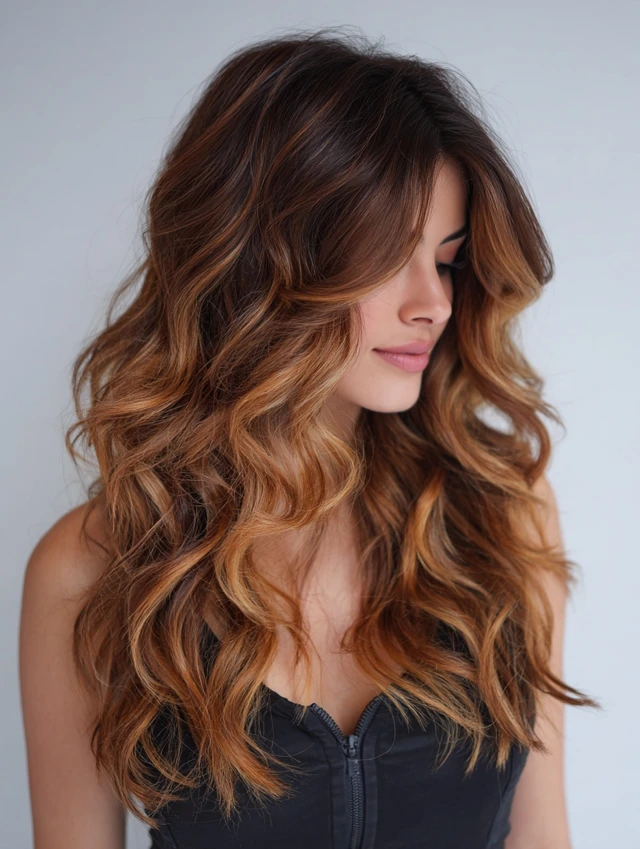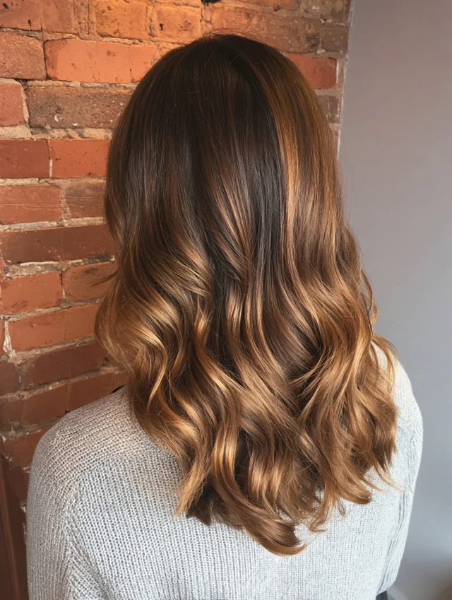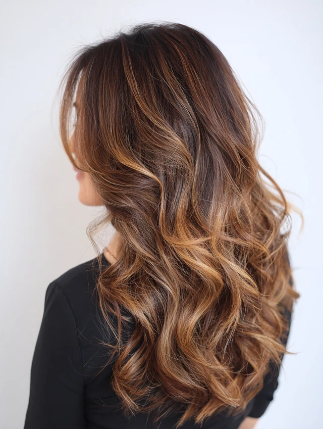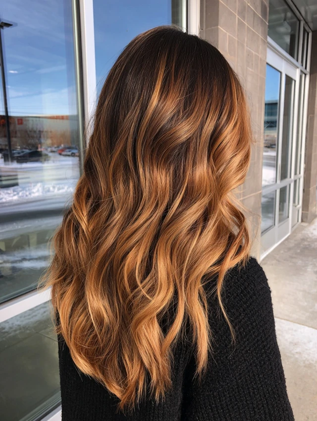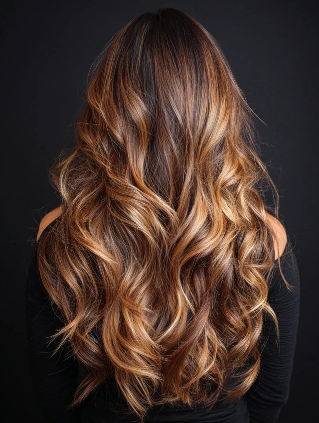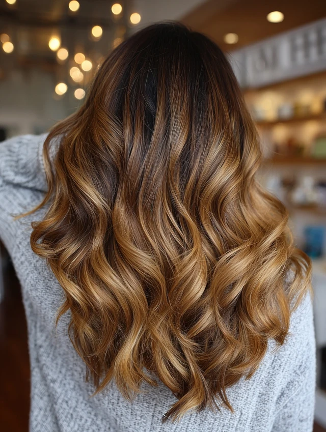 Loose waves highlight the gradient of caramel tones, giving soft, radiant movement.