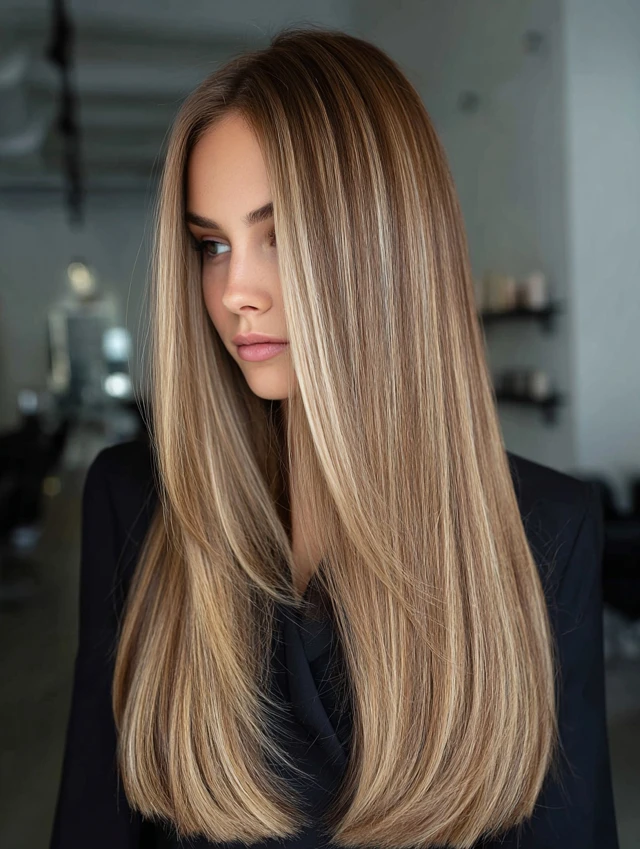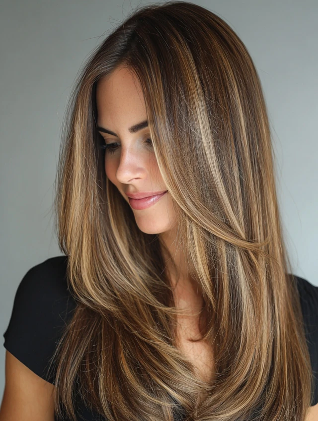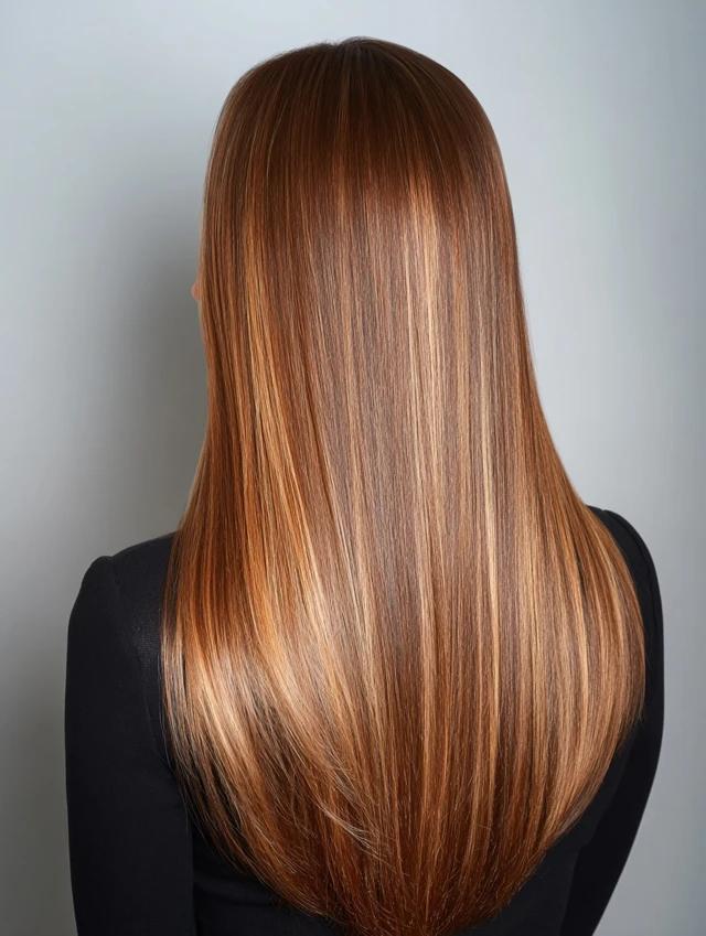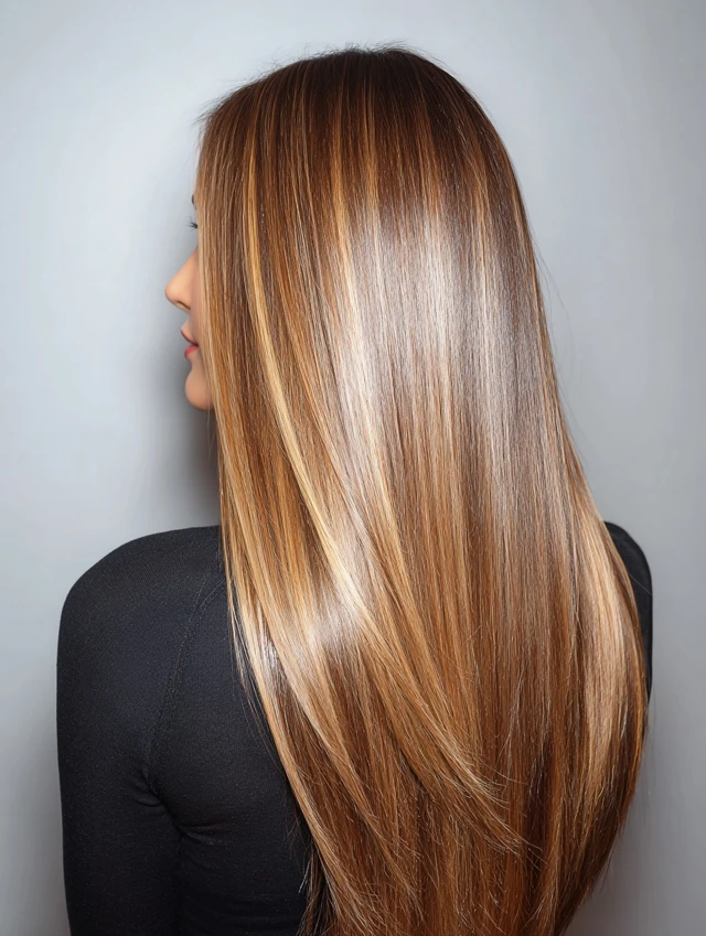 Straight hair shows off the gradient of caramel highlights, giving a polished, refined look.
