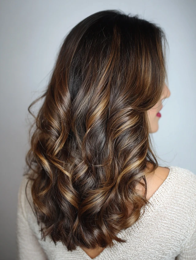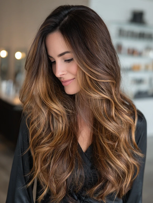 Dark roots create natural depth while caramel highlights add warmth and light, giving hair an effortless, lived-in vibe.