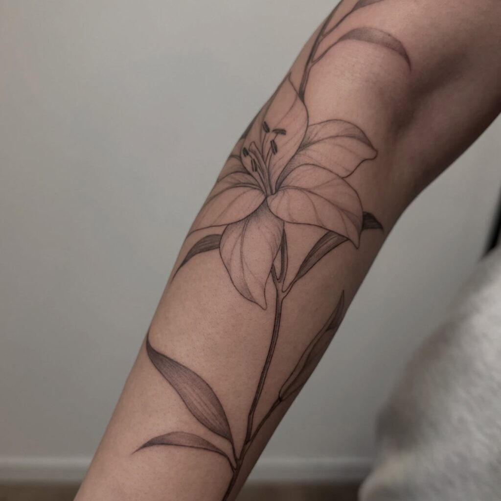 This tattoo uses delicate linework and soft shading to create a graceful lily along the inner arm. The minimalistic style highlights the flower’s elegance without heavy detail, letting the natural curves of the petals and leaves shine. Its placement gives it a personal, intimate feel.