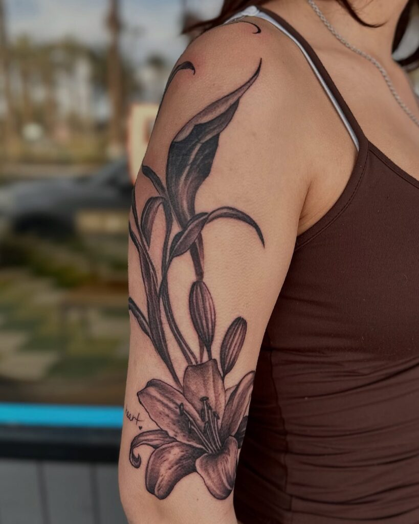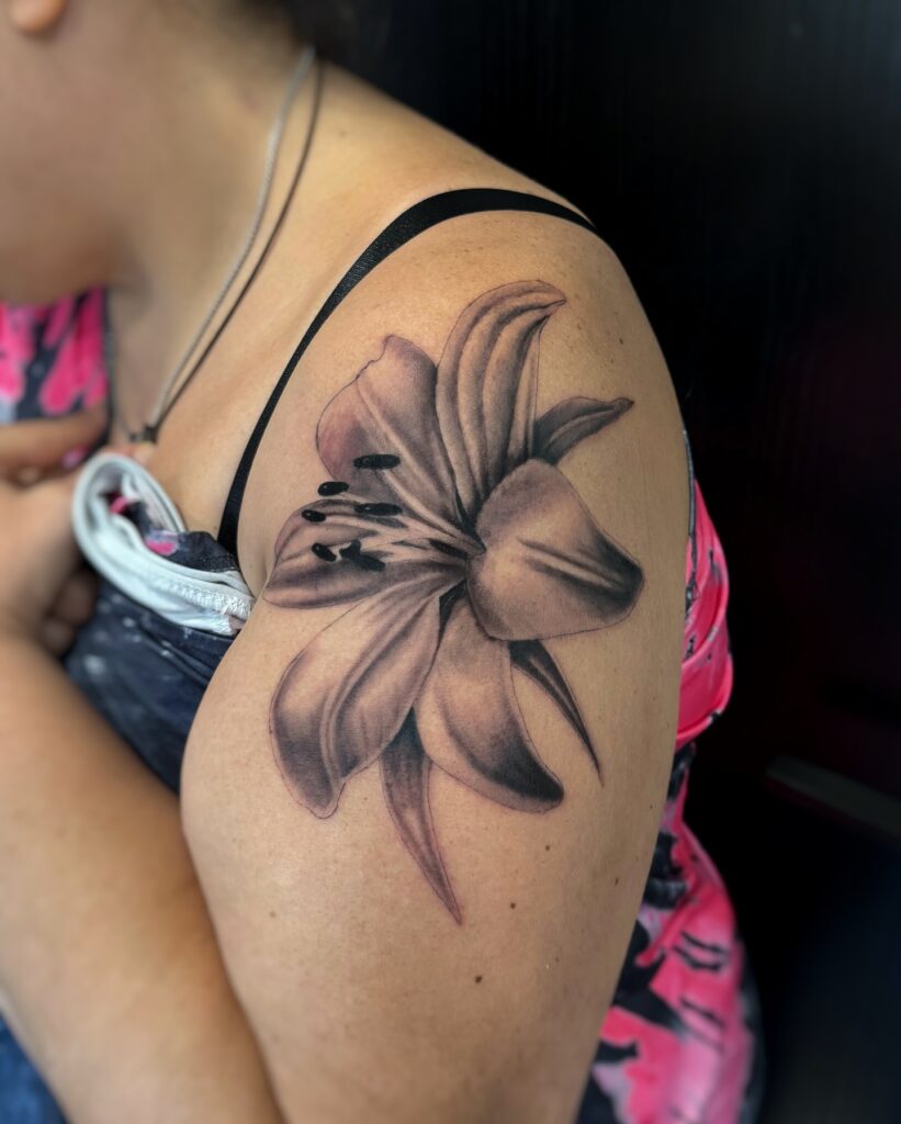 This shoulder tattoo features a single large lily inked in bold black and gray. The shading gives it depth and realism, while the flower’s placement across the shoulder makes it both strong and feminine. The petals appear soft yet powerful, radiating natural beauty.