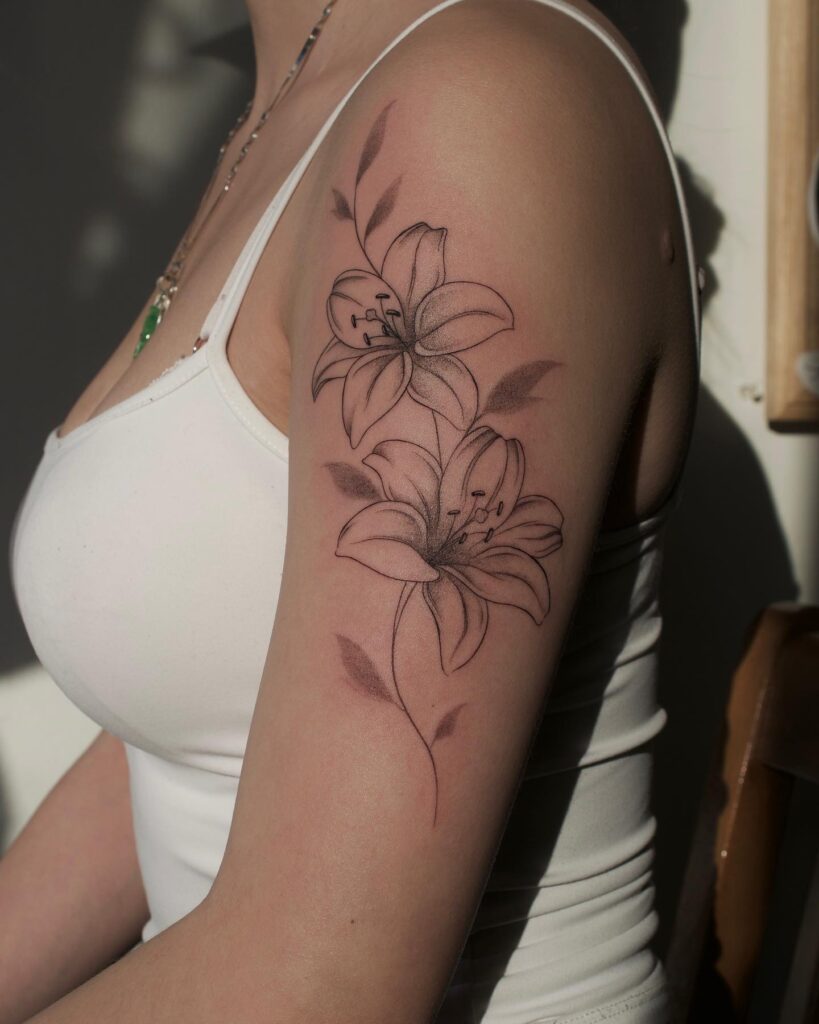 This design highlights two softly shaded lilies on the upper arm. The petals are inked with gentle transitions, creating a natural, almost watercolor effect in black and gray. The placement along the arm gives it a flowing, elegant look, blending seamlessly with the body’s curves.