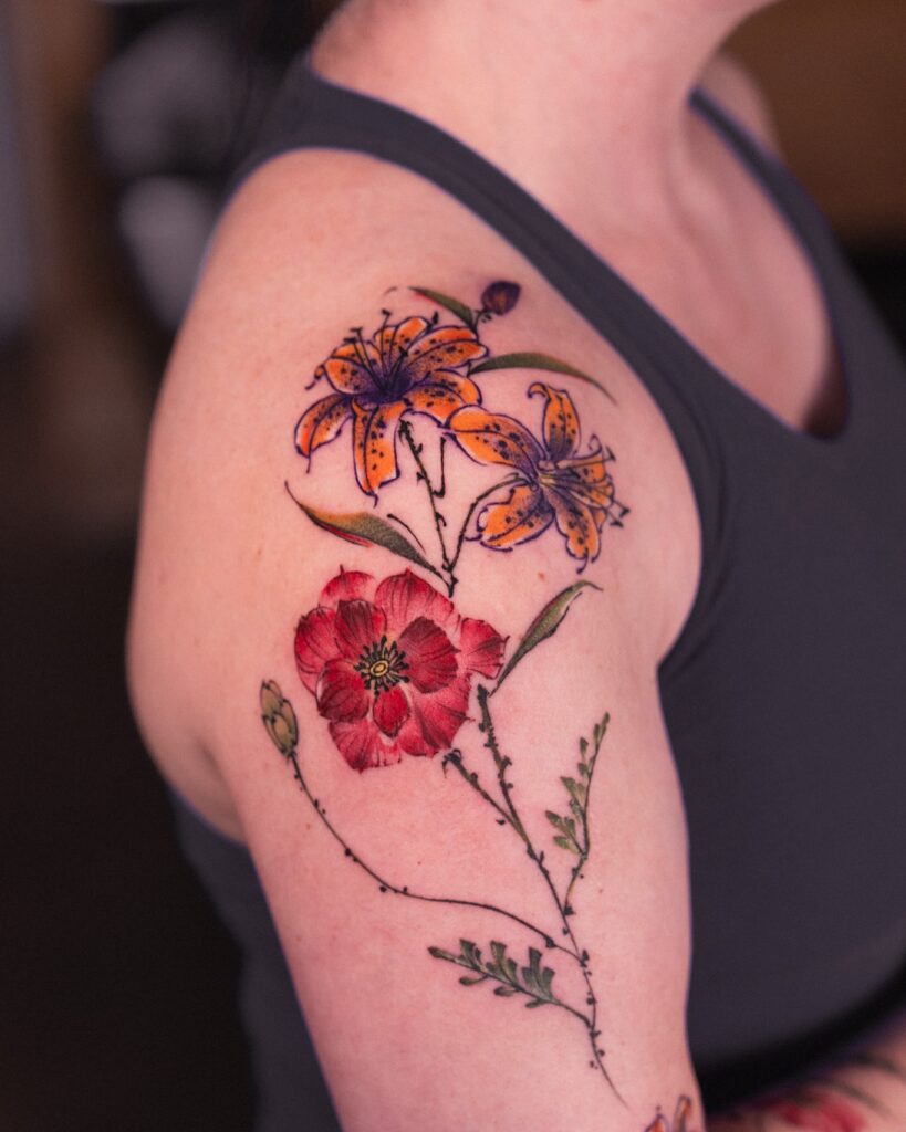 This tattoo combines the beauty of two flowers—orange lilies and a red poppy—creating a striking floral composition. The lilies bring brightness with their vivid color and speckled details, while the poppy adds bold contrast with its deep red petals. Together, they form a vibrant bouquet across the upper arm.