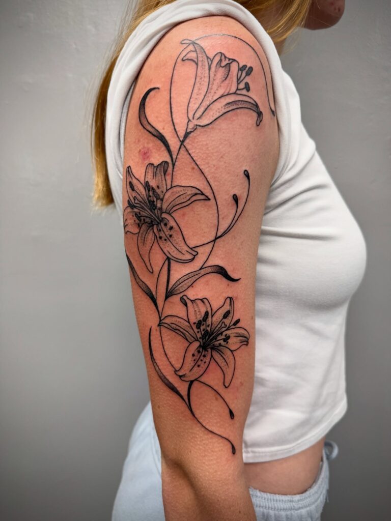 Sweeping along the upper arm, this tattoo features three blooming lilies connected by flowing stems and delicate linework. The vertical composition complements the natural shape of the arm, making the flowers appear to grow upward with graceful movement.