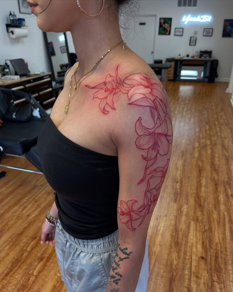 This striking tattoo uses only red ink to create lilies that stretch across the shoulder and down the arm. The absence of black outlines gives the flowers a softer, almost ethereal appearance, while the placement emphasizes the natural flow of the body.