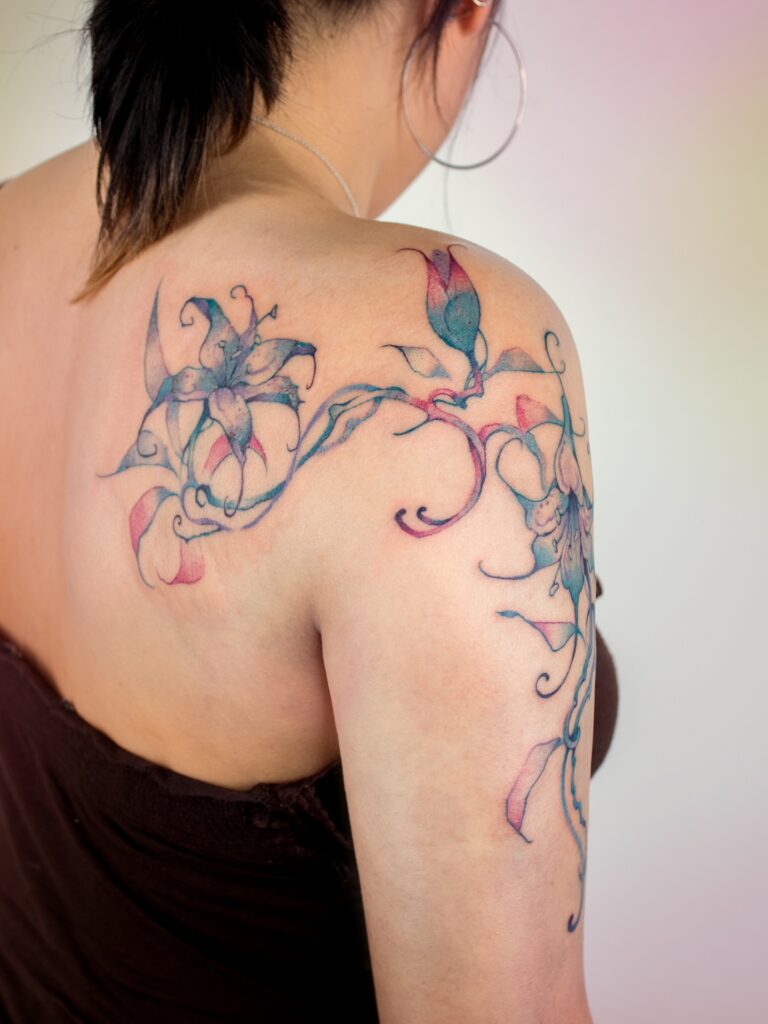 Sweeping across the shoulder and upper arm, this tattoo features entwined lilies and curling vines in a dreamy watercolor style. The blending of blue and pink tones creates a soft, ethereal effect, making the flowers appear fluid and almost alive. It’s a romantic and feminine design.