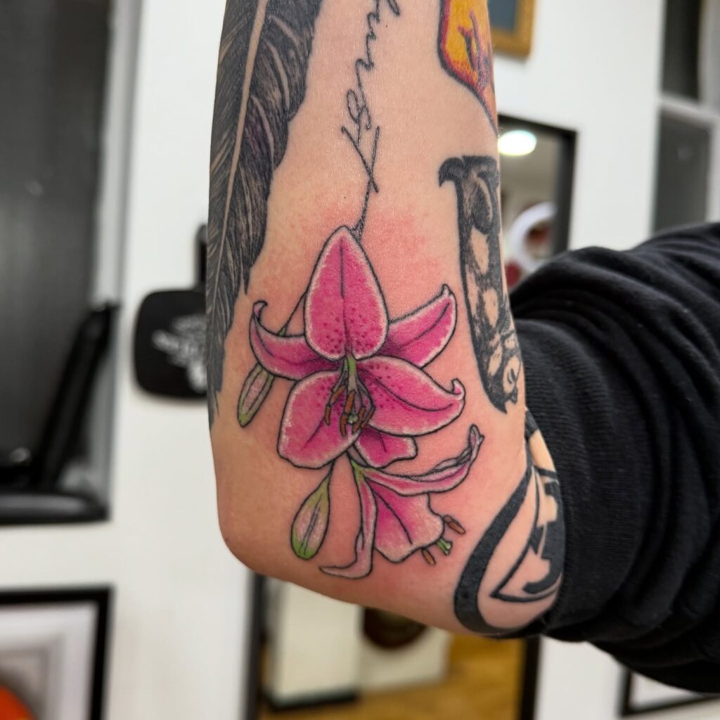 Placed delicately on the outer arm near the elbow, this pink lily tattoo captures lifelike detail with its soft shading and graceful petals. The gentle curves highlight the natural beauty of the flower while complementing the arm’s movement. Its position makes it stand out yet remain personal.