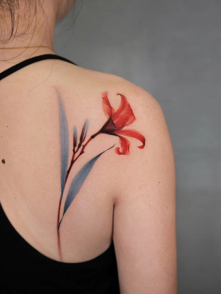 This minimalist back tattoo features a striking red lily paired with slender blue-green leaves. The watercolor shading gives it a delicate, painterly look, while the vertical placement along the shoulder blade elongates the body gracefully. The design feels elegant, refined, and artistic.