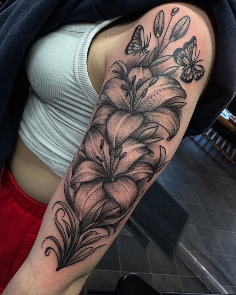 This upper-arm tattoo showcases a cluster of large lilies shaded in stunning black and gray detail. The fine dotwork and gradients give the flowers a realistic depth, while the butterflies fluttering nearby add a touch of freedom and transformation. The vertical flow complements the arm’s shape beautifully.
