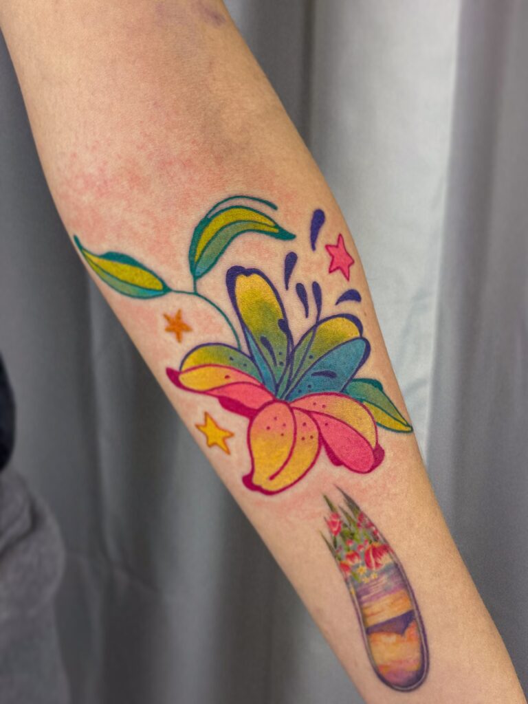 This colorful lily tattoo bursts with energy, blending bold shades of yellow, pink, and teal. Surrounded by whimsical stars and abstract splashes, it feels playful yet powerful. The forearm placement makes it instantly eye-catching and gives the design a lively, expressive charm.