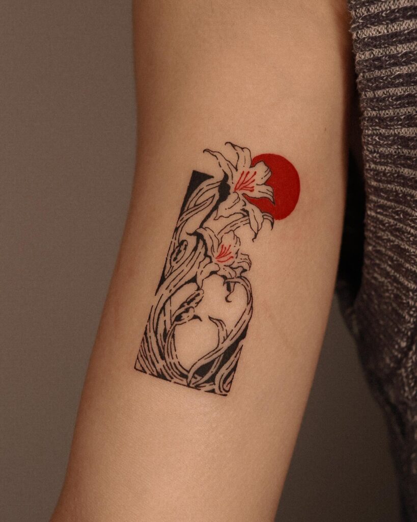 The lilies here embody elegance and purity, while the red sun introduces themes of vitality, life force, and passion. Together, they form a tattoo that feels artistic and symbolic, perfect for women who admire Japanese-inspired motifs or want a piece that merges minimalism with deep cultural meaning.
