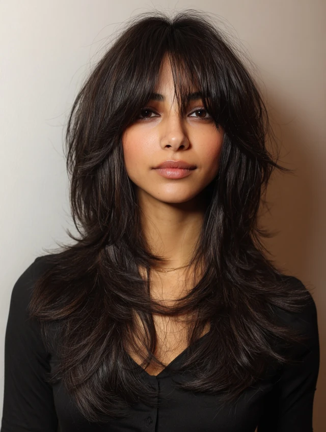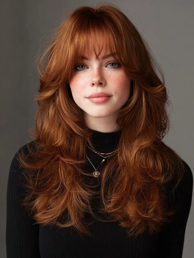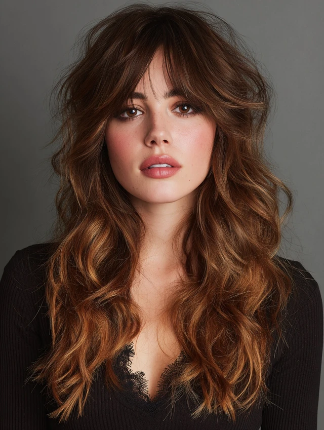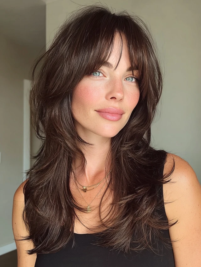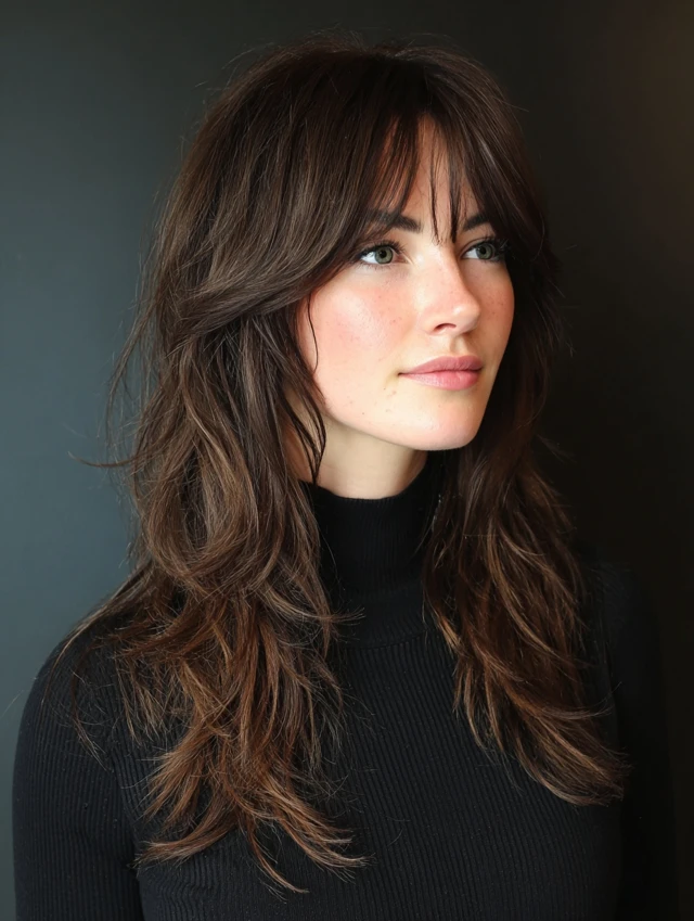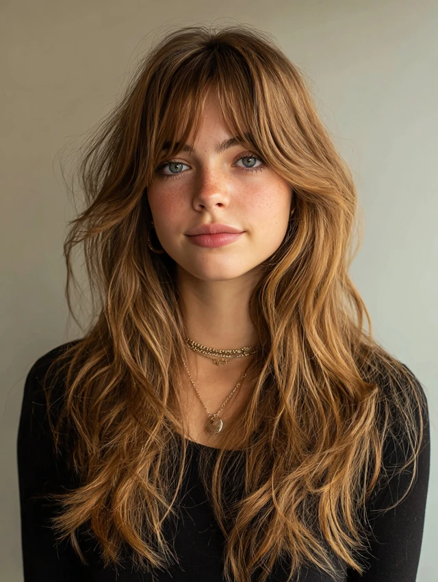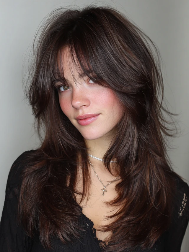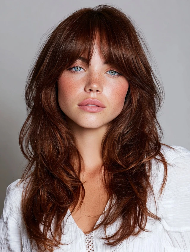 Curtain bangs add softness and face-framing while complementing shag layers.