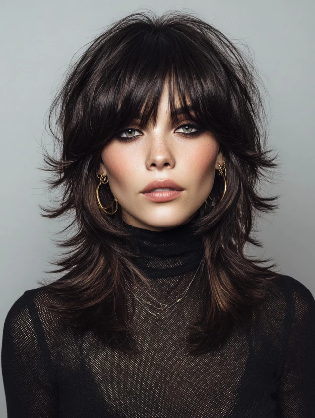 A shag with extra volume at the crown and feathered ends nods to retro 70s style while staying modern.