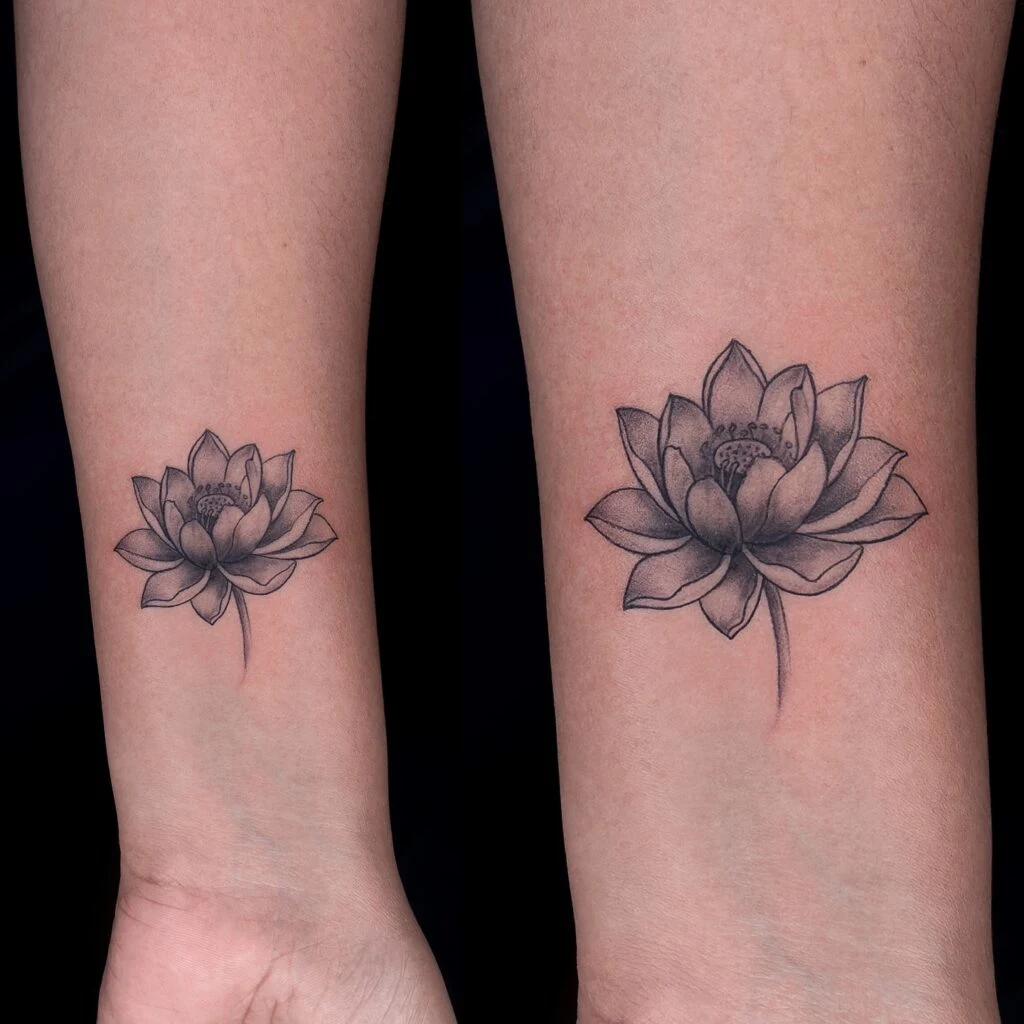 This design uses detailed shading to create a beautifully realistic lotus bloom. The soft gradient of dark and light ink gives the petals a lifelike depth and dimension.