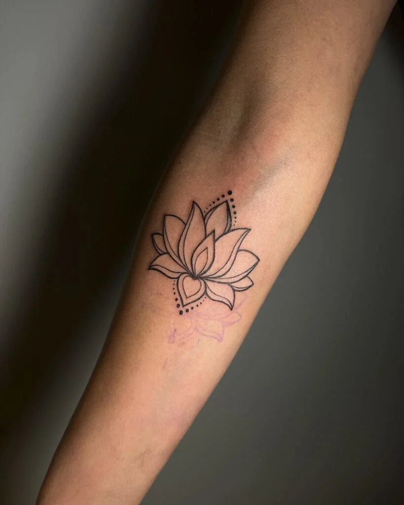 This minimalist lotus tattoo embraces clean lines and elegant simplicity. Each petal is carefully outlined, creating a soft yet powerful look that draws attention to its symmetrical beauty. The small dotted accents add an extra touch of delicacy and balance.