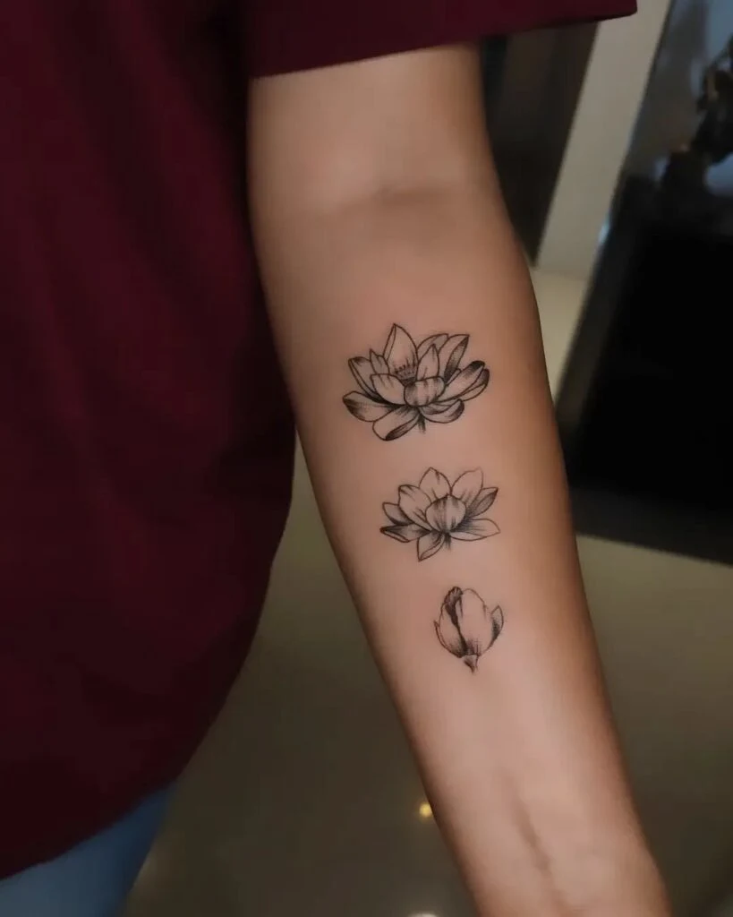 Ideal for first-time tattoo enthusiasts, this design offers a graceful way to express themes of purity, rebirth, and self-growth. Its placement on the arm allows for subtle visibility, making it perfect for someone who wants a meaningful piece without being too bold or overpowering.