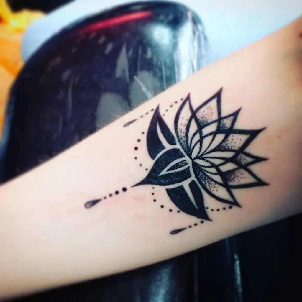 This tattoo reimagines the lotus with a clean, geometric approach. Its simple linework and symmetrical shapes give it a modern, minimalist vibe.