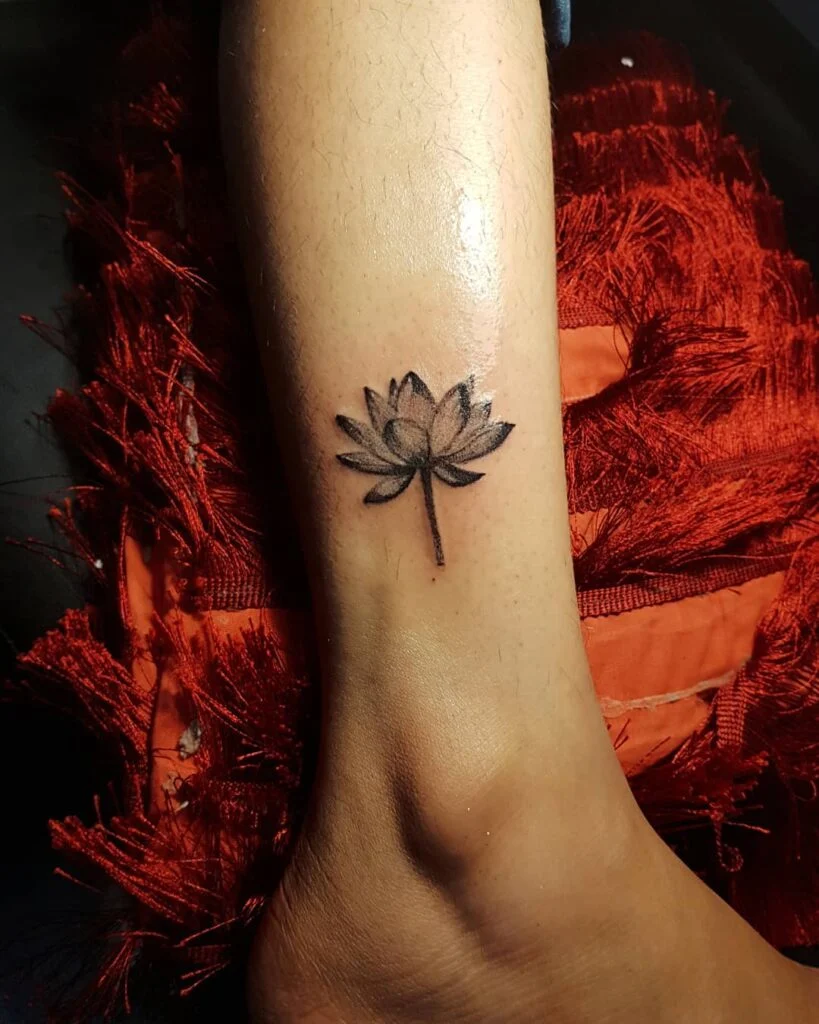 This delicate lotus tattoo features a single stem with a softly shaded bloom. Its simplicity highlights the beauty of minimalism, while the shading adds depth and realism.