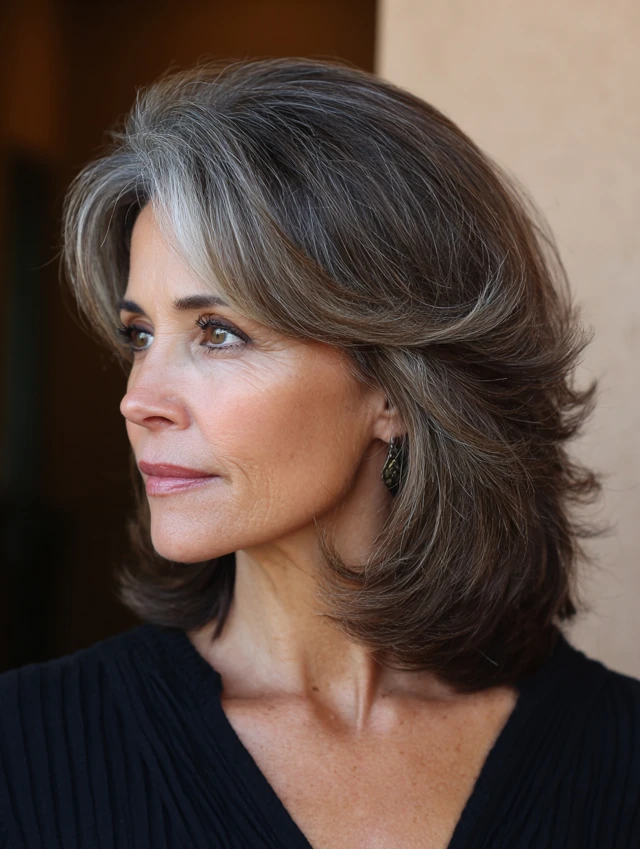 Medium length hairstyles for women over 50 with layers offer the ideal balance between manageability and versatility. Sitting between the shoulders and collarbone, this length provides enough weight to feel polished while still allowing layers to create movement, lift, and softness. It’s a practical choice that adapts easily to different hair types and styling preferences.