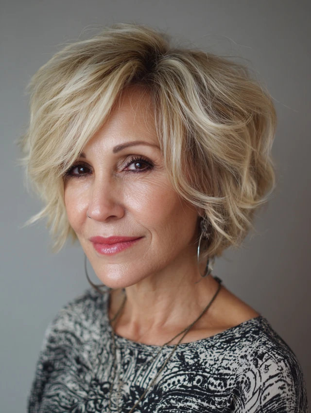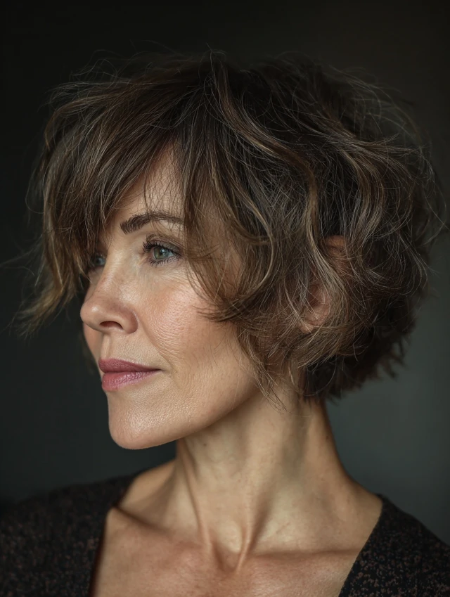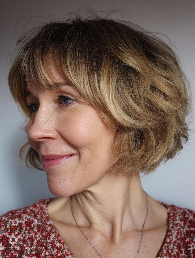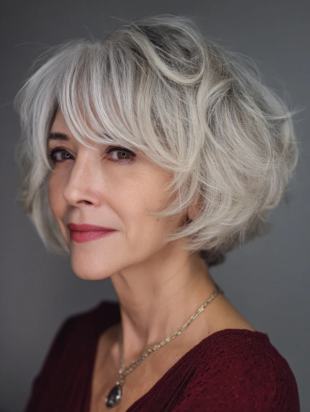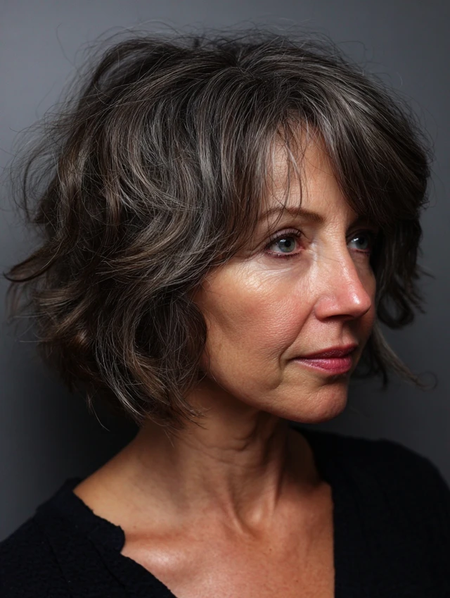Messy bob hairstyles for women over 50 offer a modern, effortless approach to styling. The relaxed texture and soft structure create a flattering, easy-to-maintain look.