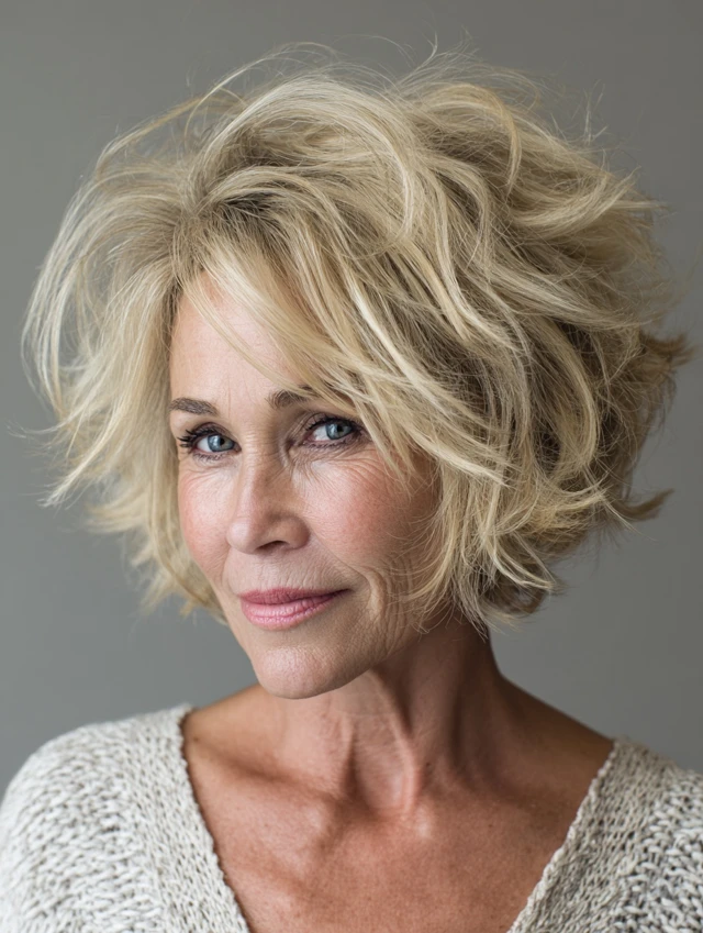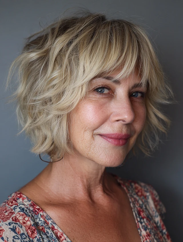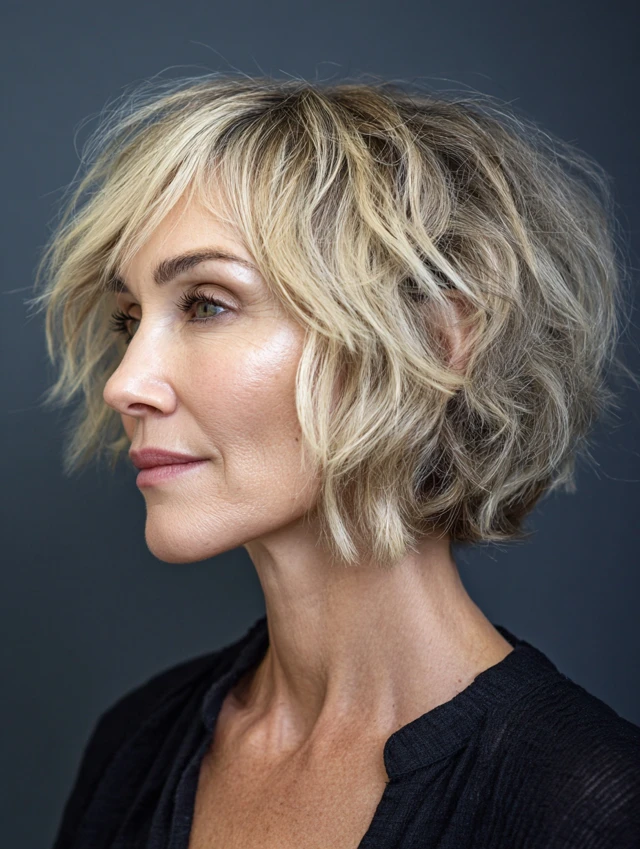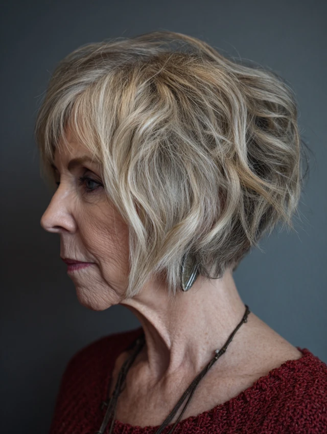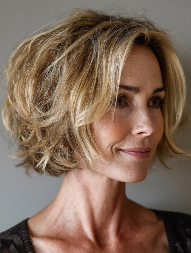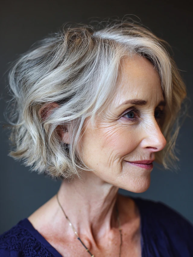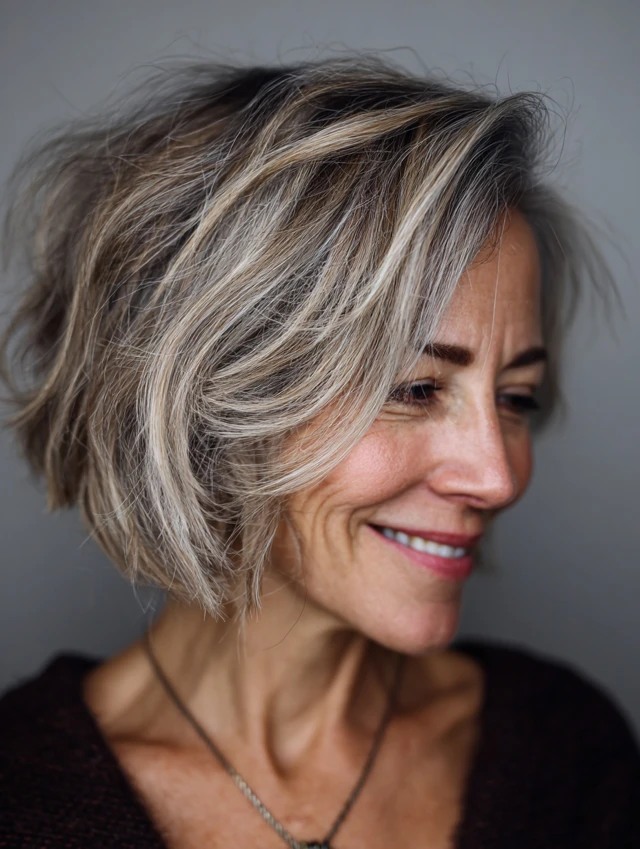 Messy bob hairstyles for women over 50 are built around relaxed structure, soft texture, and natural movement. Instead of a perfectly polished finish, these styles embrace an intentionally undone look that still feels balanced and flattering. The bob shape provides structure, while layering and texturizing create that effortless, slightly tousled effect.