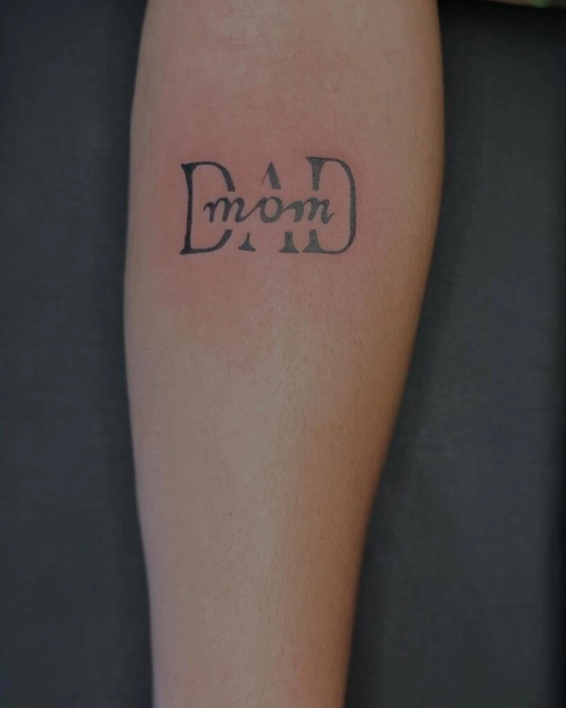 This creative black ink tattoo merges the words “Mom” and “Dad” into a powerful ambigram design. At first glance, the bold, uppercase letters spell out “DAD,” but nestled within is the word “mom” written in script, showing how both parental figures coexist at the heart of the wearer’s identity.