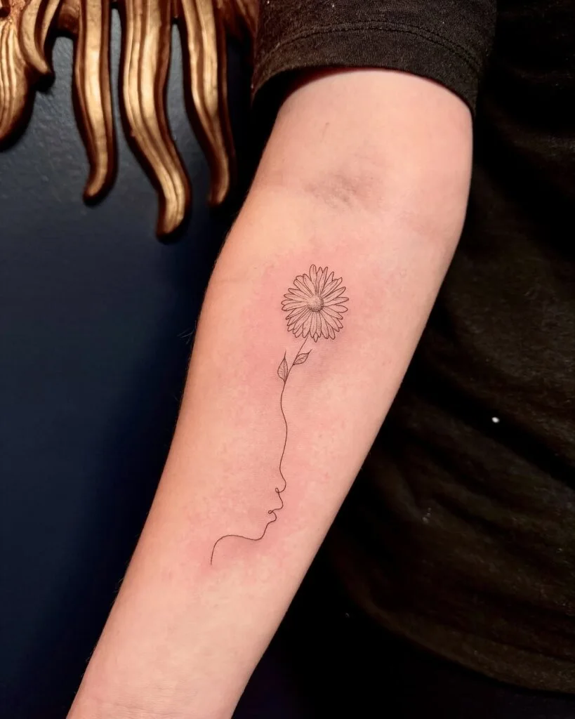 This minimalist tattoo beautifully blends a woman’s side profile with a blooming flower. Drawn in fine single-line style, the outline of the face seamlessly transitions into a delicate daisy, symbolizing growth, femininity, and the nurturing nature of motherhood.