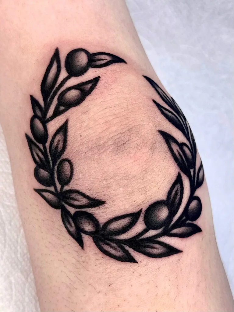 The bold black shading emphasizes strength and permanence. Women who choose this tattoo often connect it with resilience and honor, drawing from the olive wreath’s ancient symbolism. It’s both a decorative and meaningful choice, blending timeless heritage with personal empowerment.
