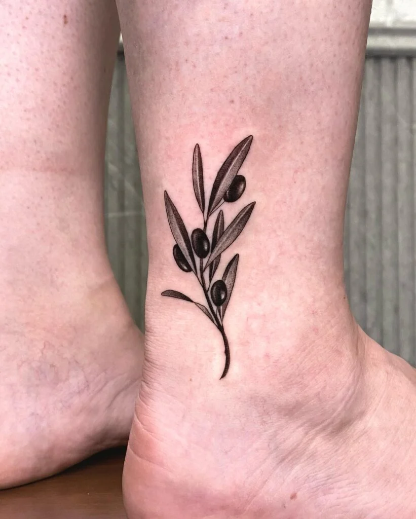 This ankle tattoo features a slim olive branch with neatly shaded leaves and fruits, creating a subtle yet captivating design. Its vertical flow flatters the ankle, making it ideal for women who want something elegant but not overwhelming.