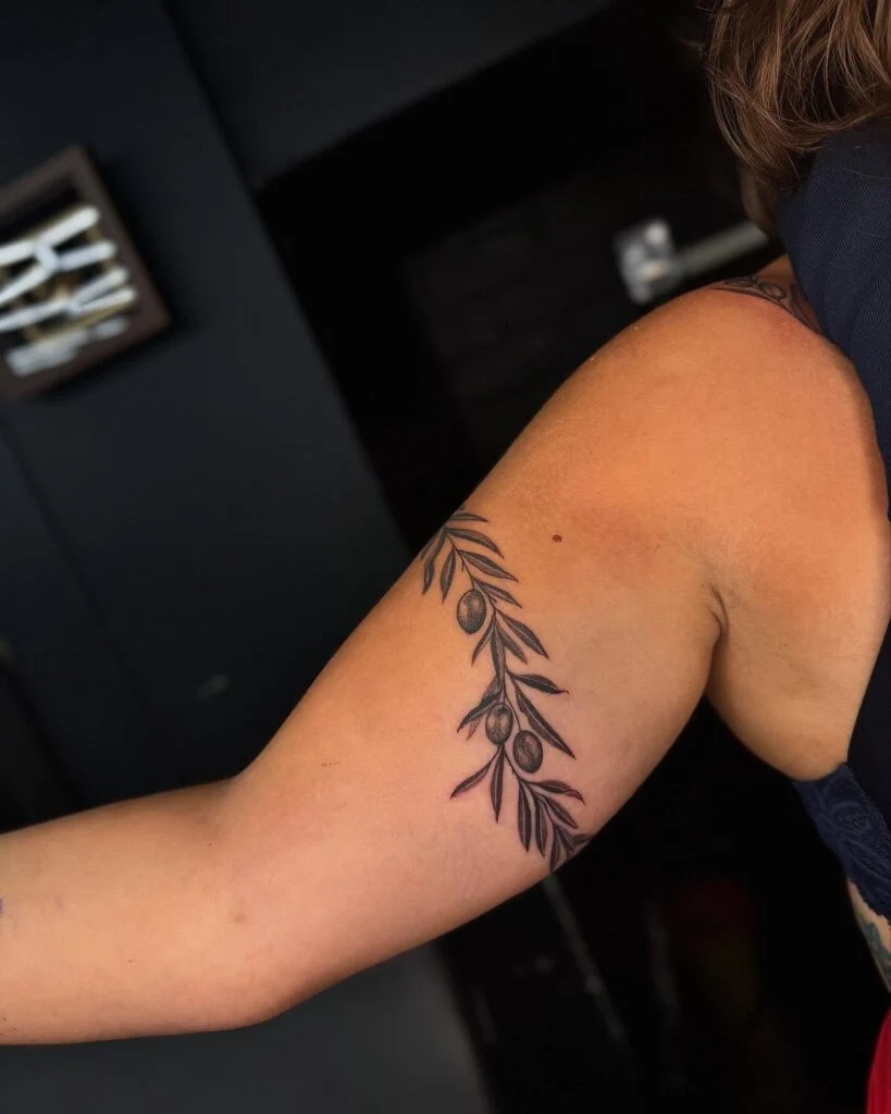 This upper arm tattoo features a flowing olive branch that extends along the curve of the arm, emphasizing natural beauty and graceful movement. The elongated design highlights the arm’s shape, giving it an elegant and feminine look.